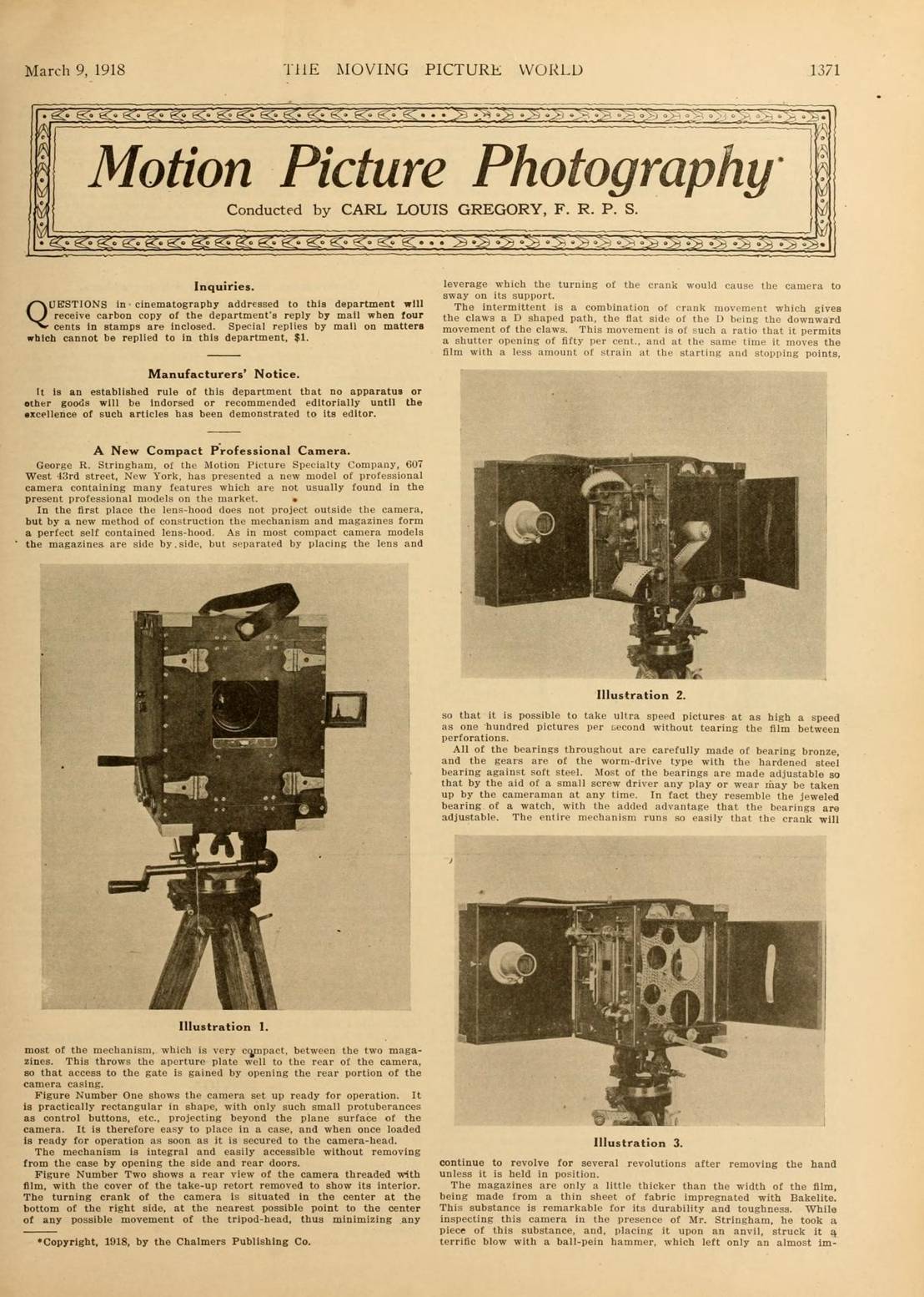 ground glass focusing frame to swing into position. The article also states the camera's magazines and casing as being
