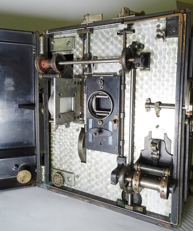 film magazine compartments and the rear access door, reveals the etched and